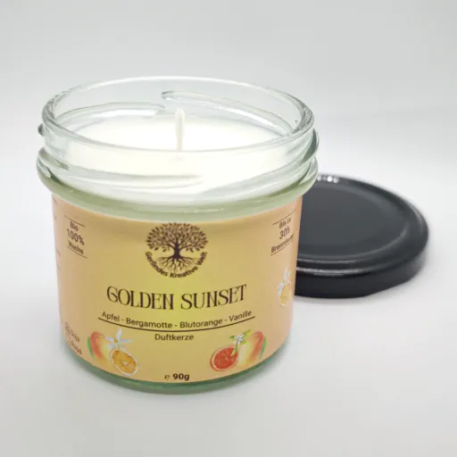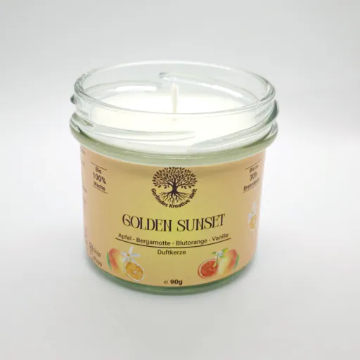 Wenn der Tag langsam zur Ruhe kommt und der Himmel in warmen Orangetönen glüht, beginnt der Moment der Duftkerze Golden Sunset. Dieser Duft trägt die Wärme eines Spätsommers in sich: reife Mango, saftig und weich, trifft auf die lebendige Frische von Blutorange.