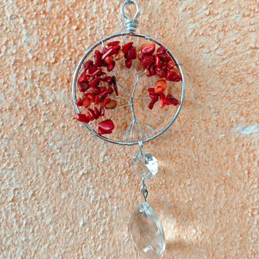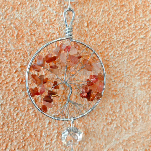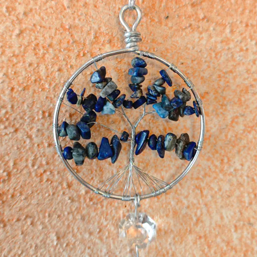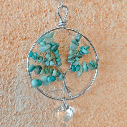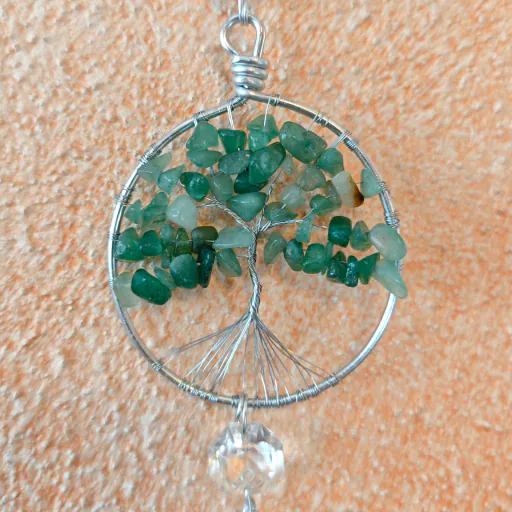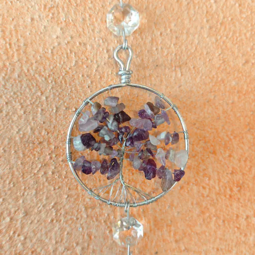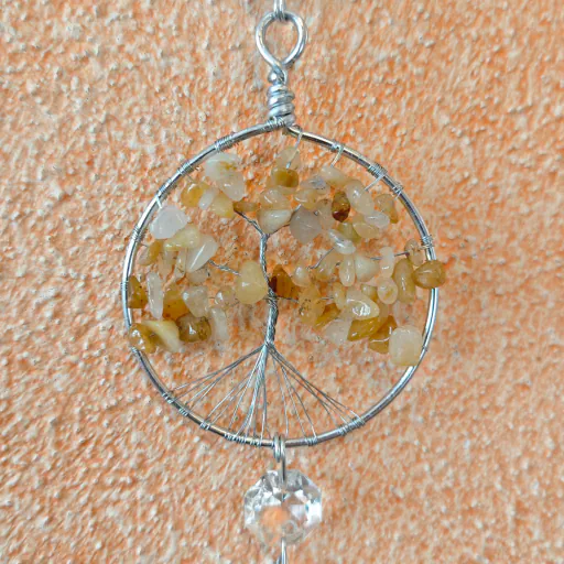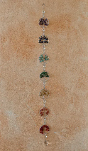 Die kunstvoll gewickelten Steine formen sieben kleine Lebensbäume, die wie Energiezentren übereinander angeordnet sind. Ergänzt durch funkelnde Facettensteine und einen großen facettierten Tropfen, der das Licht in regenbogenartige Reflexe bricht, entsteht ein lebendiges Spiel aus Farbe und Energie.