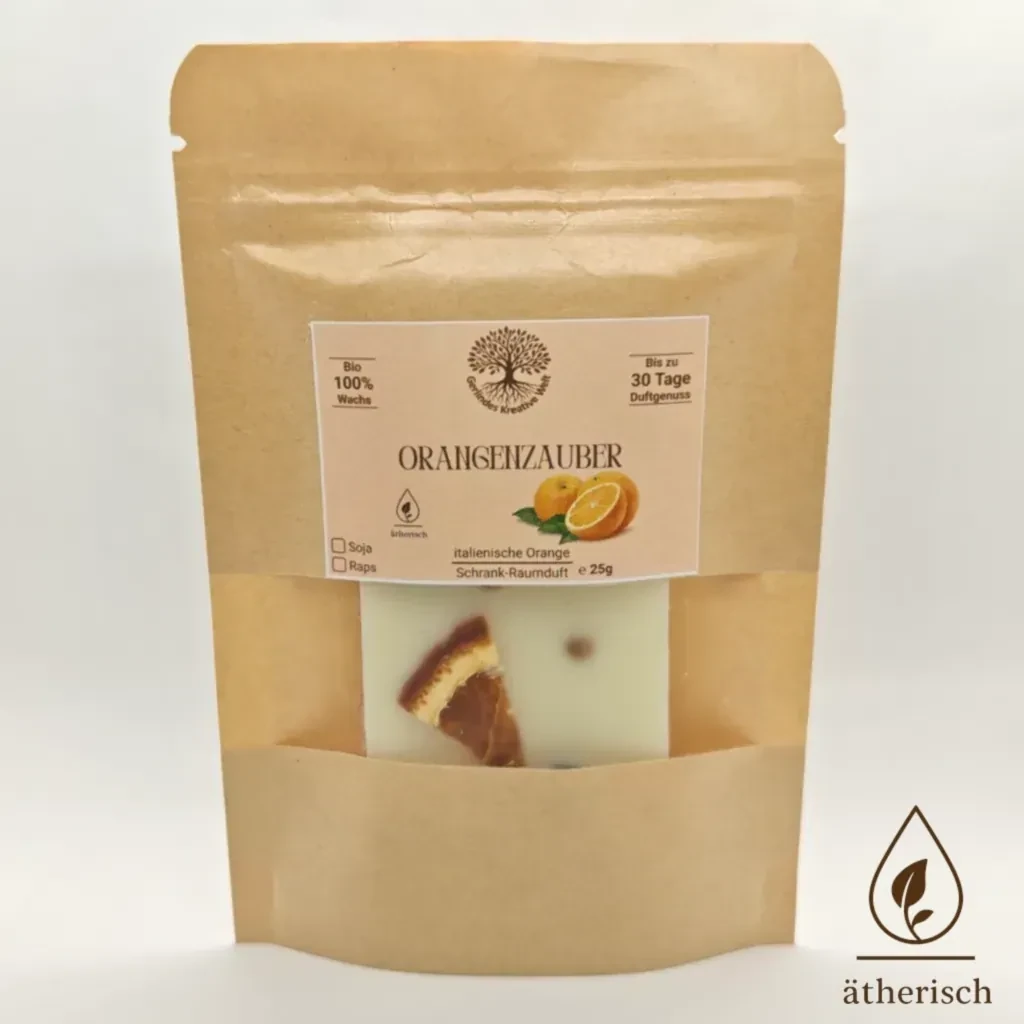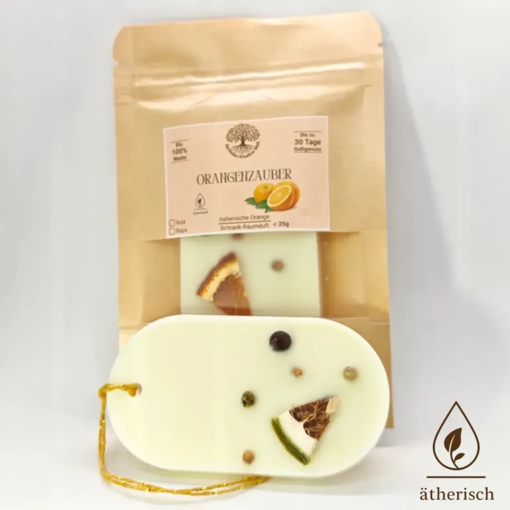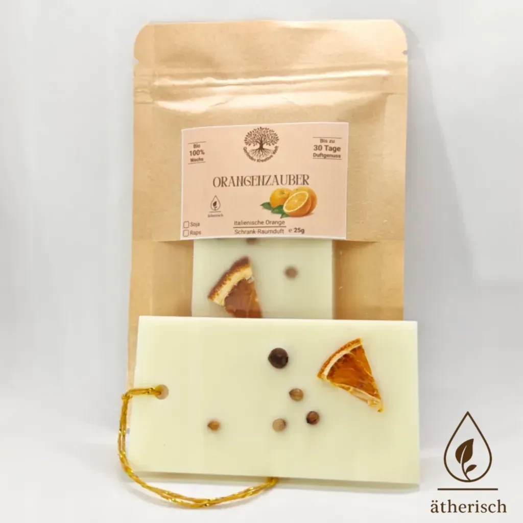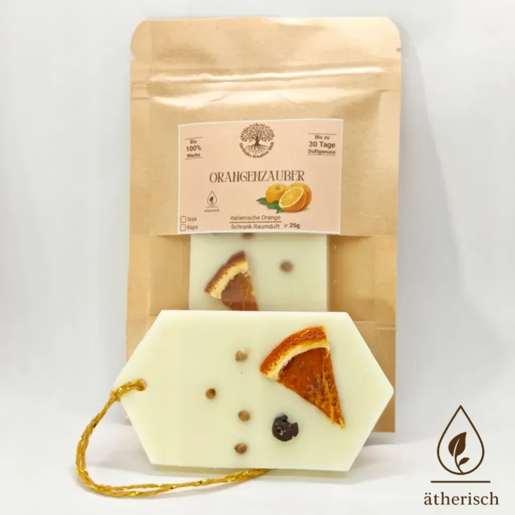 Sanft öffnest du die Schranktür – ein frischer, sonniger Duft strömt dir entgegen. Süße italienische Orangen entfalten ihre natürliche Leichtigkeit und schenken deinem Zuhause ein Gefühl von Wärme und Lebensfreude. Der Orangenzauber Schrank‑Raumduft ist wie ein kleiner Sonnenstrahl, der Kleidung, Räume und Momente mit mediterraner Frische erfüllt und seinen Duft bis zu 30 Tage verbreitet. Handgegossen aus Soja‑ oder Rapswachs. Hergestellt in Österreich. Wähle aus drei liebevoll gestalteten Formen oder lass dich einfach überraschen.