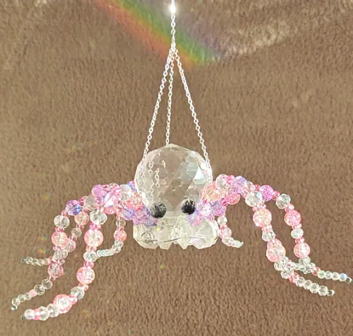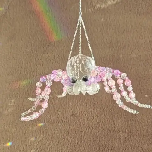 Pink Oktobaby ist ein handgefertigter Suncatcher aus der Reihe der Oktopoden, der mit seinen rosa Akzenten und dem funkelnden Kristallkörper sofort alle Blicke auf sich zieht. Jede einzelne Perle wurde sorgfältig ausgewählt, um ein harmonisches Farbspiel aus Rosa, Lila, Schwarz und klaren Facettensteinen zu erzeugen. Der große facettierte Kristall mit einem Durchmesser von ca. 4cm reflektiert das Licht und zaubert kleine Regenbogenpunkte in den Raum – ein magischer Effekt, der das Pink Oktobaby zu einem besonderen Deko‑Highlight macht.