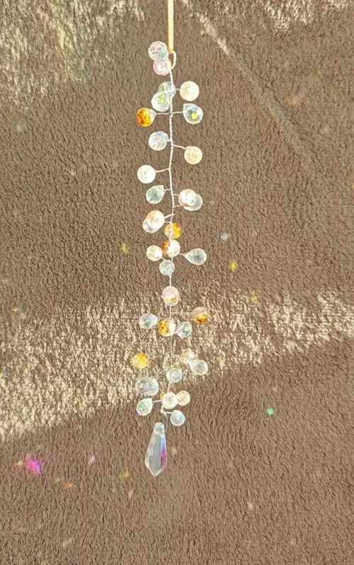 Die Kombination aus klaren, irisierenden und warm getönten Perlen erzeugt ein lebendiges Farbspiel, das sich je nach Lichteinfall verändert. Am unteren Ende bildet ein großer Kristalltropfen den strahlenden Mittelpunkt: Er bricht jeden Sonnenstrahl in feine Regenbogenlichter, die sanft durch den Raum tanzen.